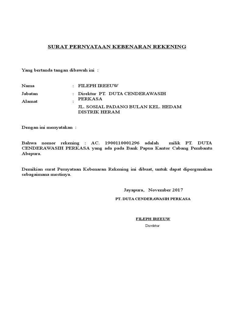 Contoh Surat Pernyataan No Rekening Perusahaan - Contoh Seputar Surat