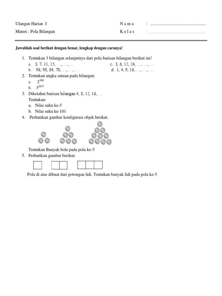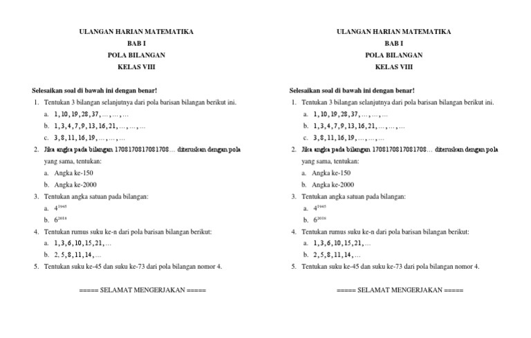 Ulangan Harian Matematika Bab I Pola Bilangan Kelas Viii Ulangan Harian Matematika Bab I Pola Bilangan Kelas Viii