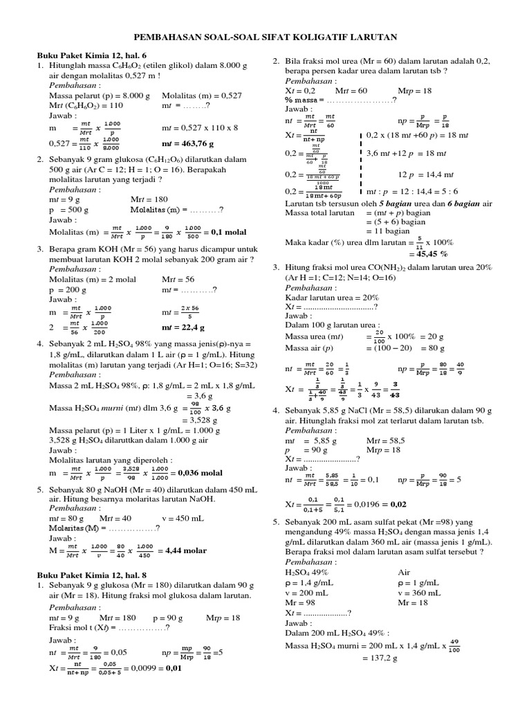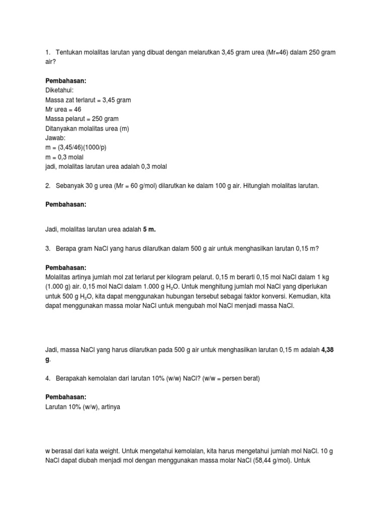 SIFAT KOLIGATIF LARUTAN - .m = molalitas larutan n = jumlah ion α = derajat ionisasi. Contoh Soal - [PDF Document]