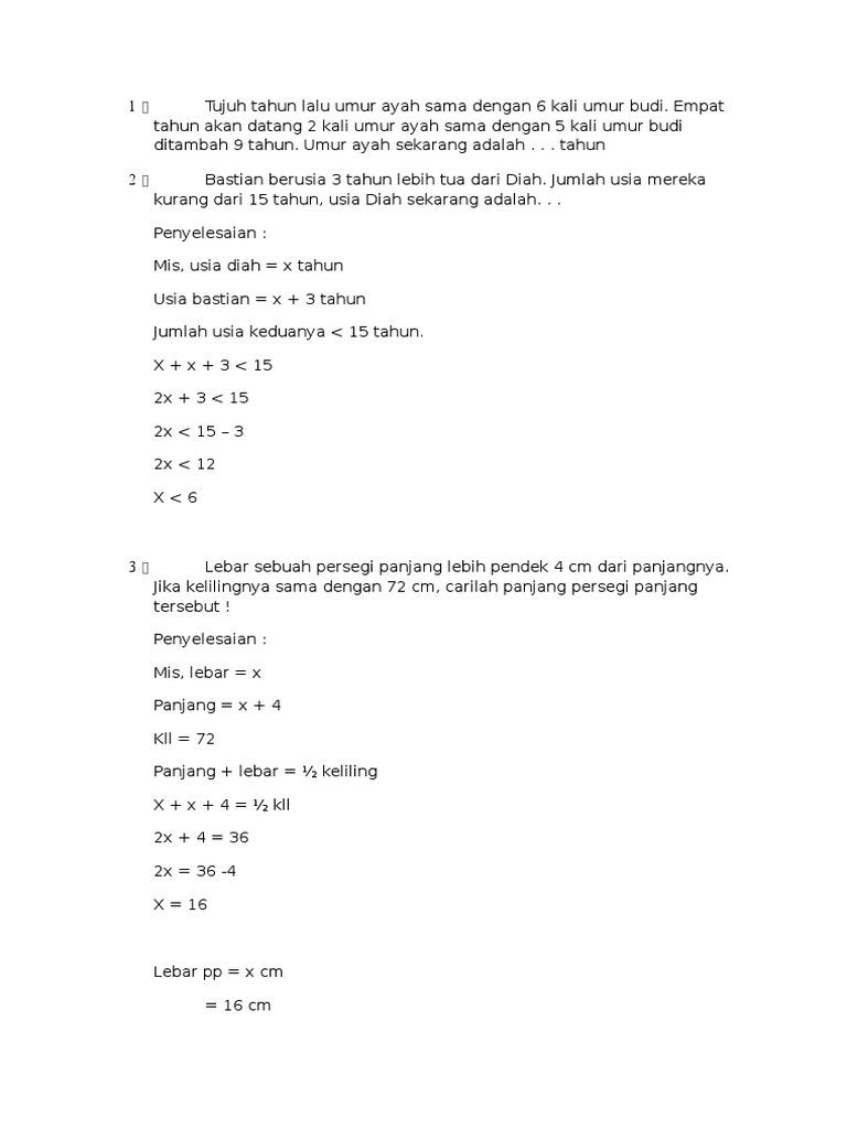 1. Jika tujuh tahun yang lalu umur ayah sama dengan 6 kali umur …
