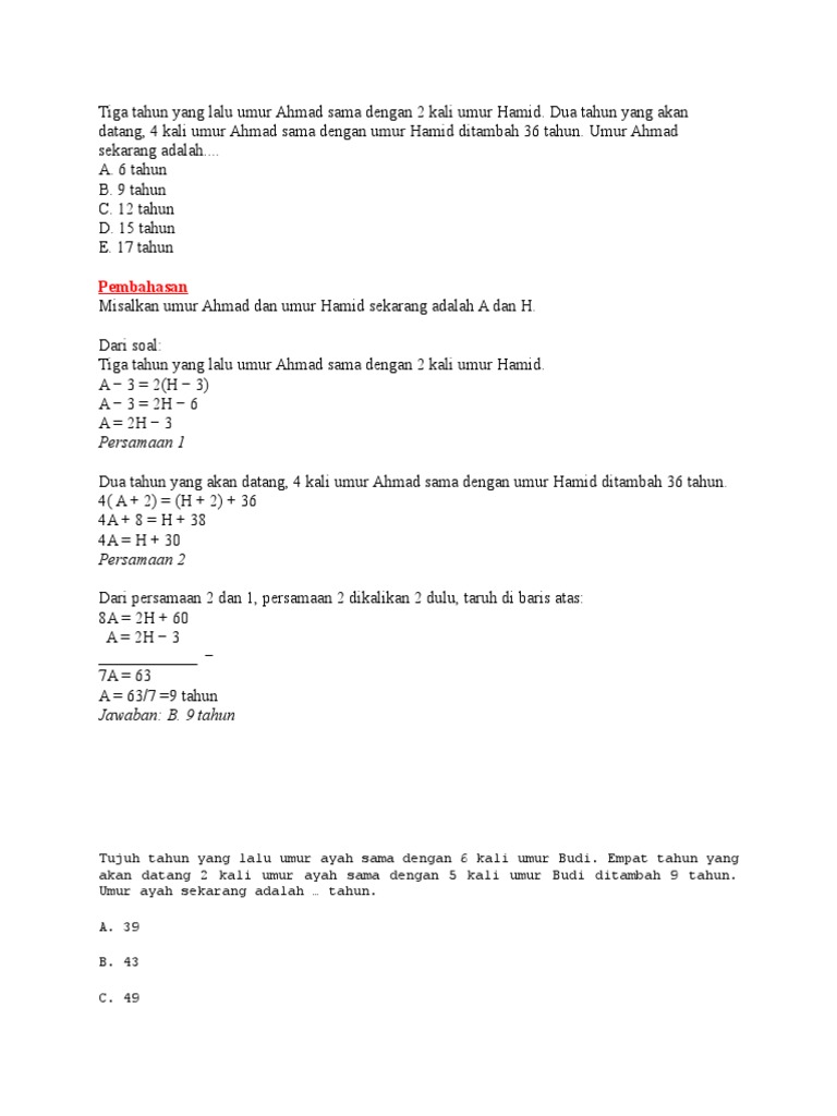 perbandingan umur, persamaan linear, bocoran unas matematika sma …