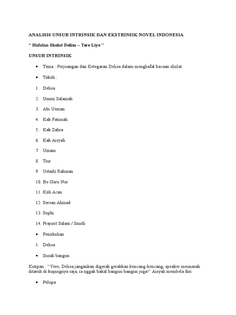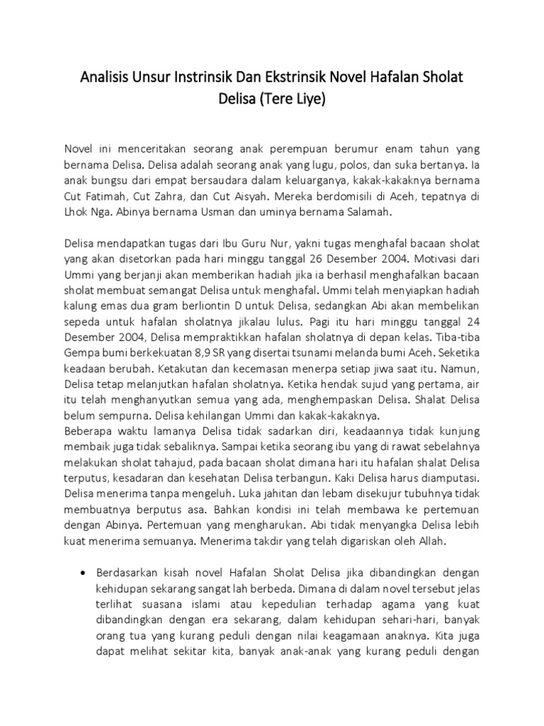 Analisis Unsur Instrinsik Dan Ekstrinsik Novel Hafalan Sholat Delisa …
