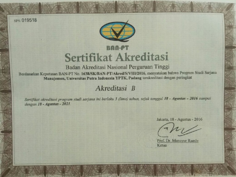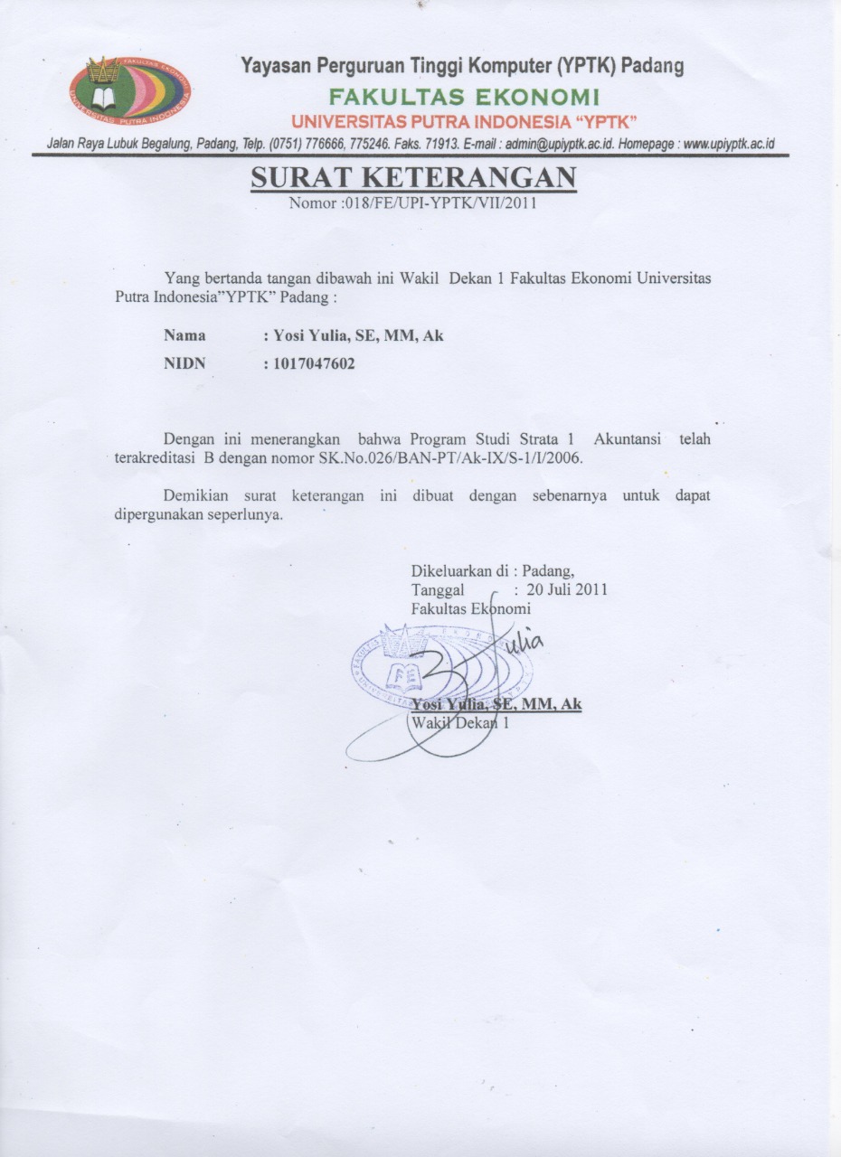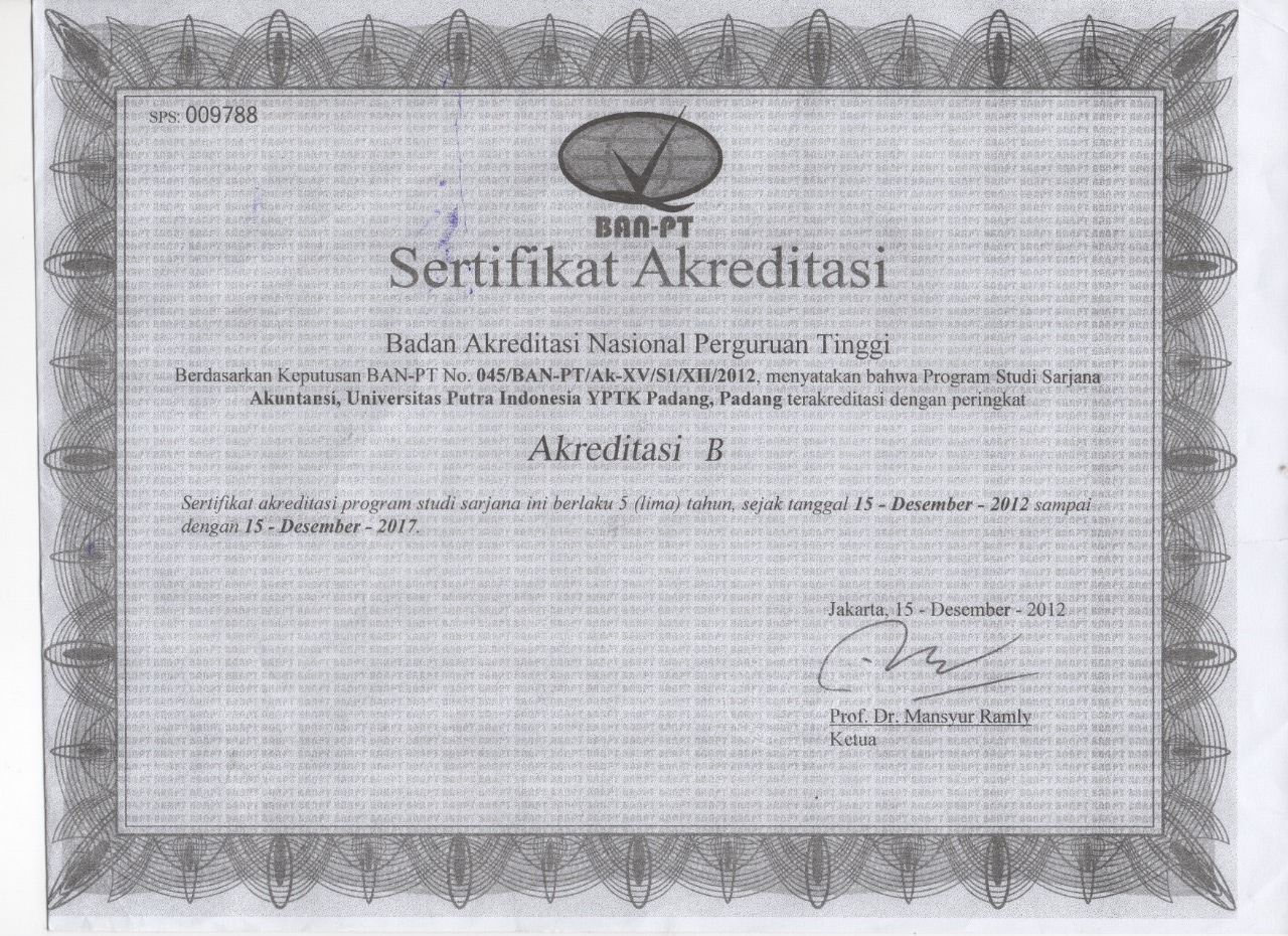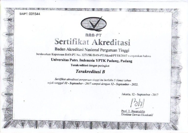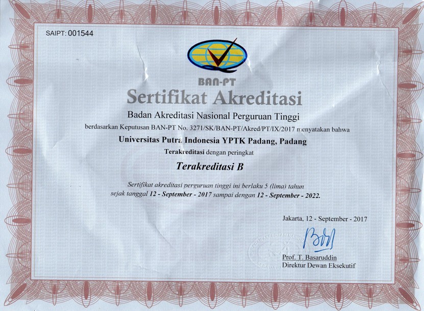 Sertifikat Akreditasi - Universitas Putra Indonesia (YPTK) Padang