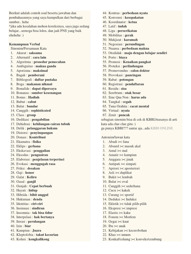 Kemampuan Verbal Sinonim/Persamaan Kata: Kbbi Online