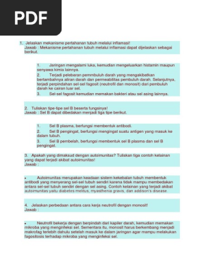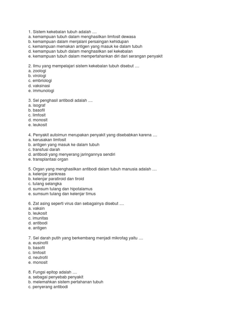 1. Sistem kekebalan tubuh adalah …. a. kemampuan tubuh dalam menghasilkan limfosit dewasa b. kemampuan dalam menjalani persain