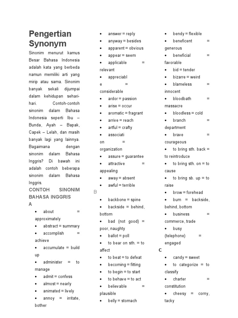 100+ Vocabulary Synonym Bahasa Inggris dan Artinya