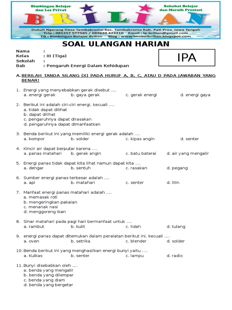 Soal IPA Kelas 3 SD Bab 9 Pengaruh Energi Dalam Kehidupan Dan …