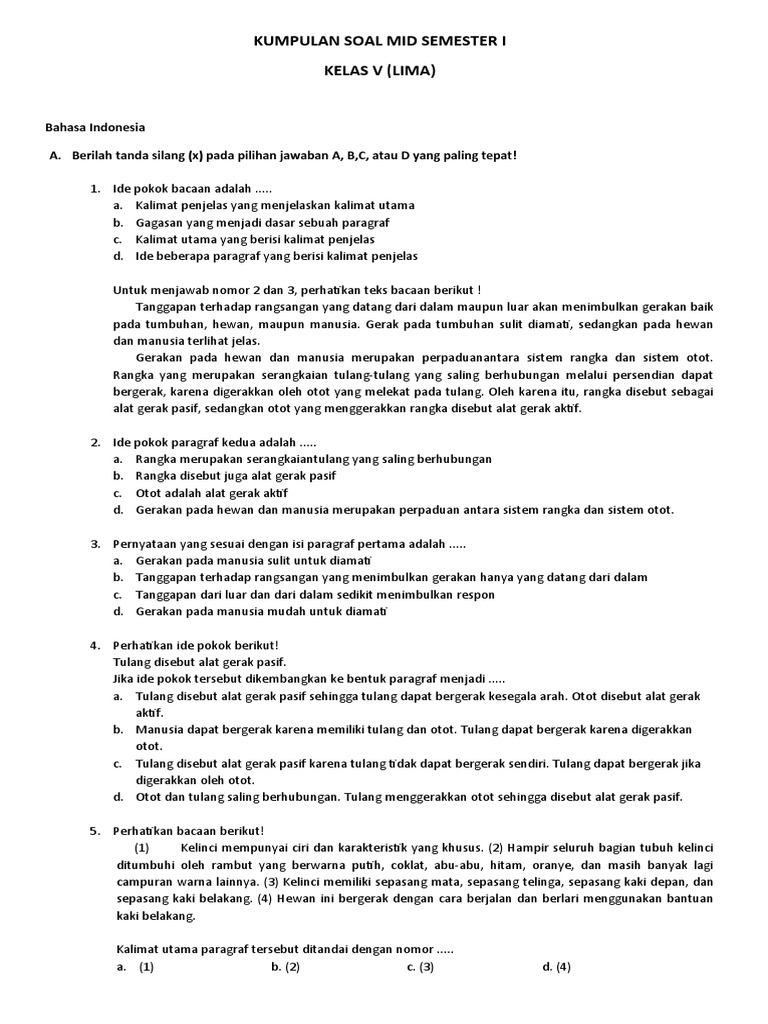 Kumpulan Soal Mid Semester I Kelas V (Lima)