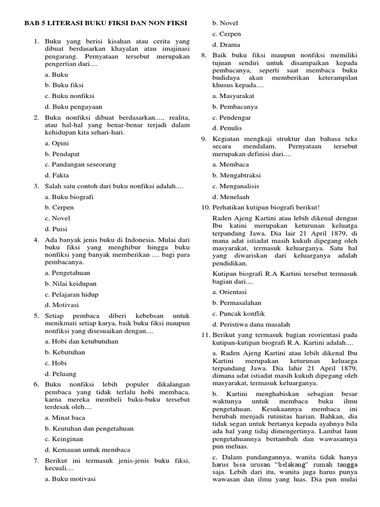 Contoh Soal Buku Fiksi dan Nonfiksi Pilihan Ganda dan Jawaban