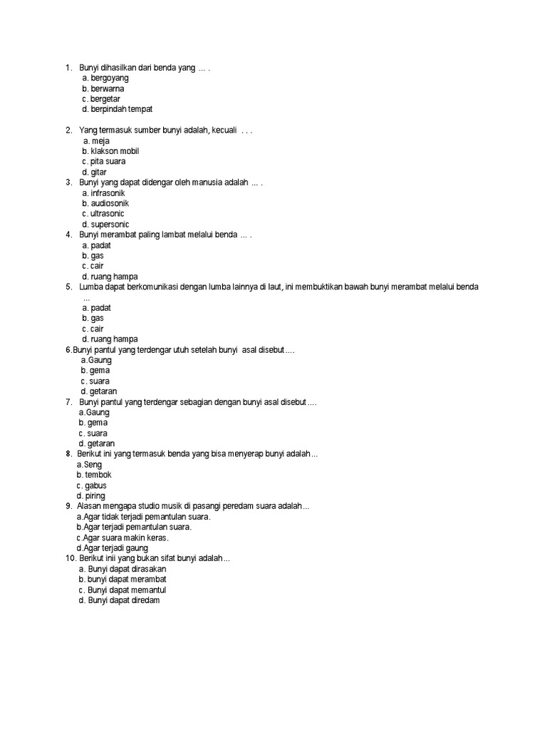 1.Bunyi dihasilkan dari benda yang….a. Bergetarb. BergoyangC …