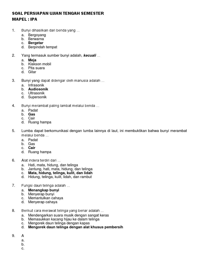 Soal Persiapan Ujian Tengah Semester Mapel: Ipa