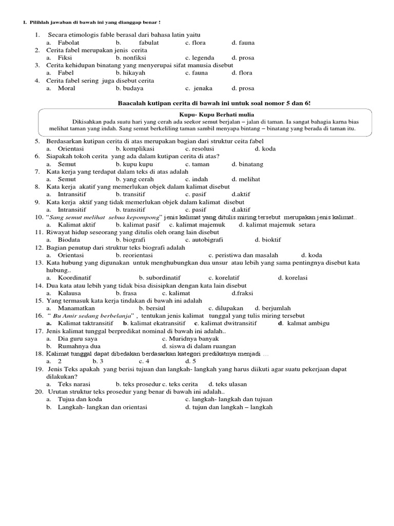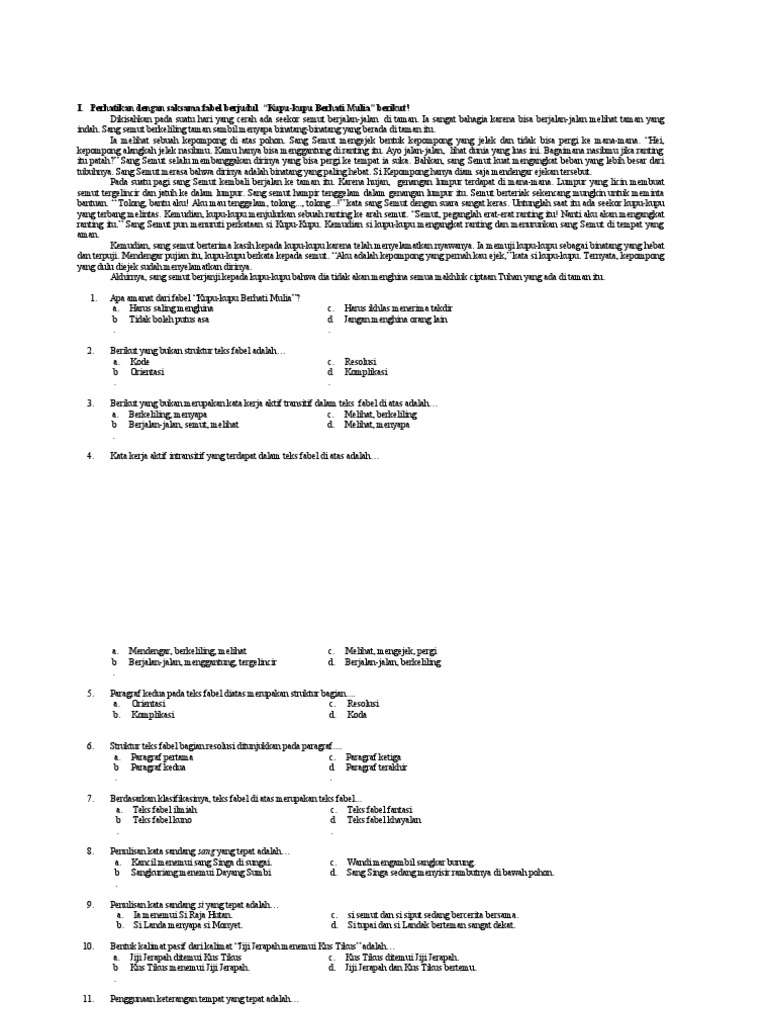 I. Perhatikan dengan saksama fabel berjudul “Kupu-kupu Berhati …