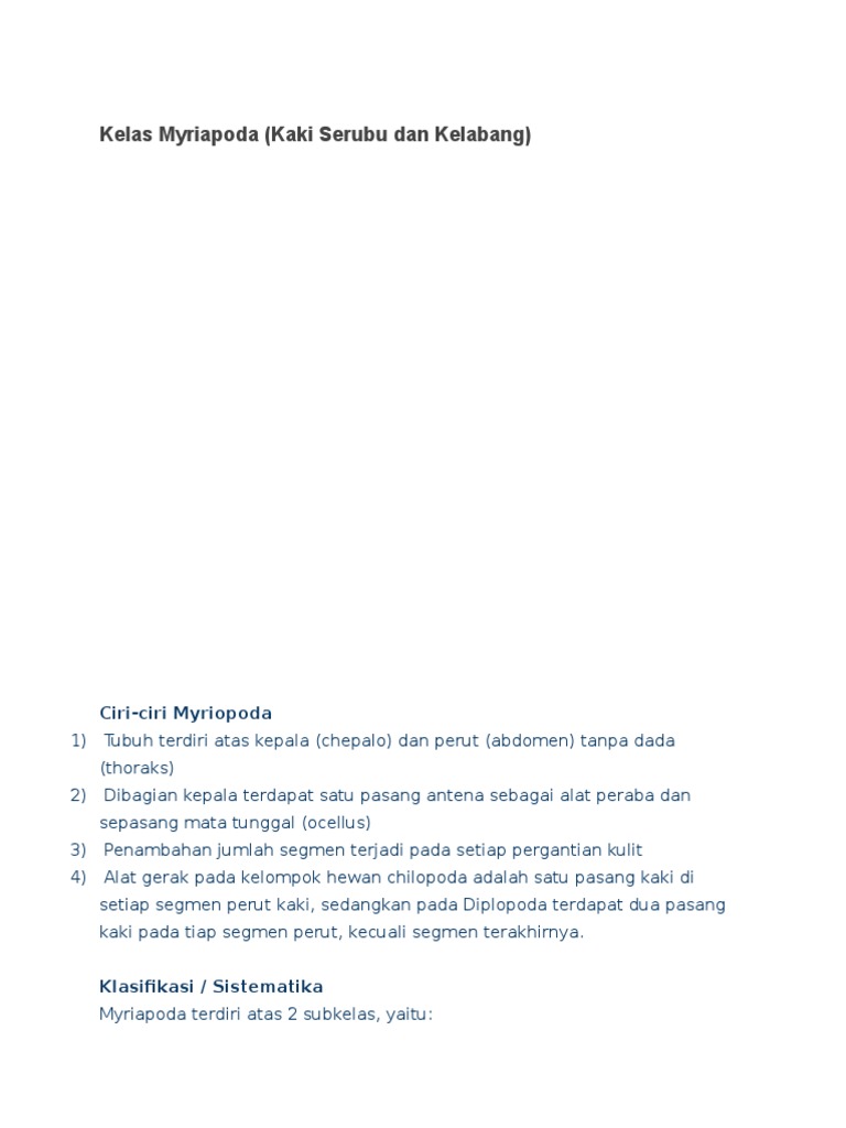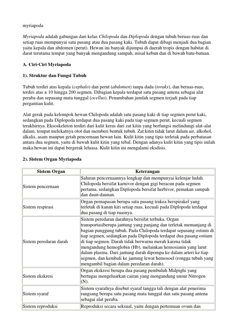 Myriapoda adalah gabungan dari kelas Chilopoda dan Diplopoda …