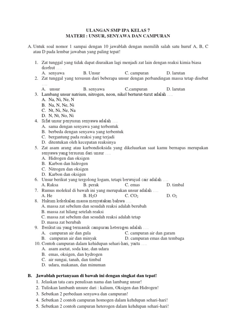 Soal-soal IPA Kelas 7 Ulangan materi unsur senyawa dan campuran