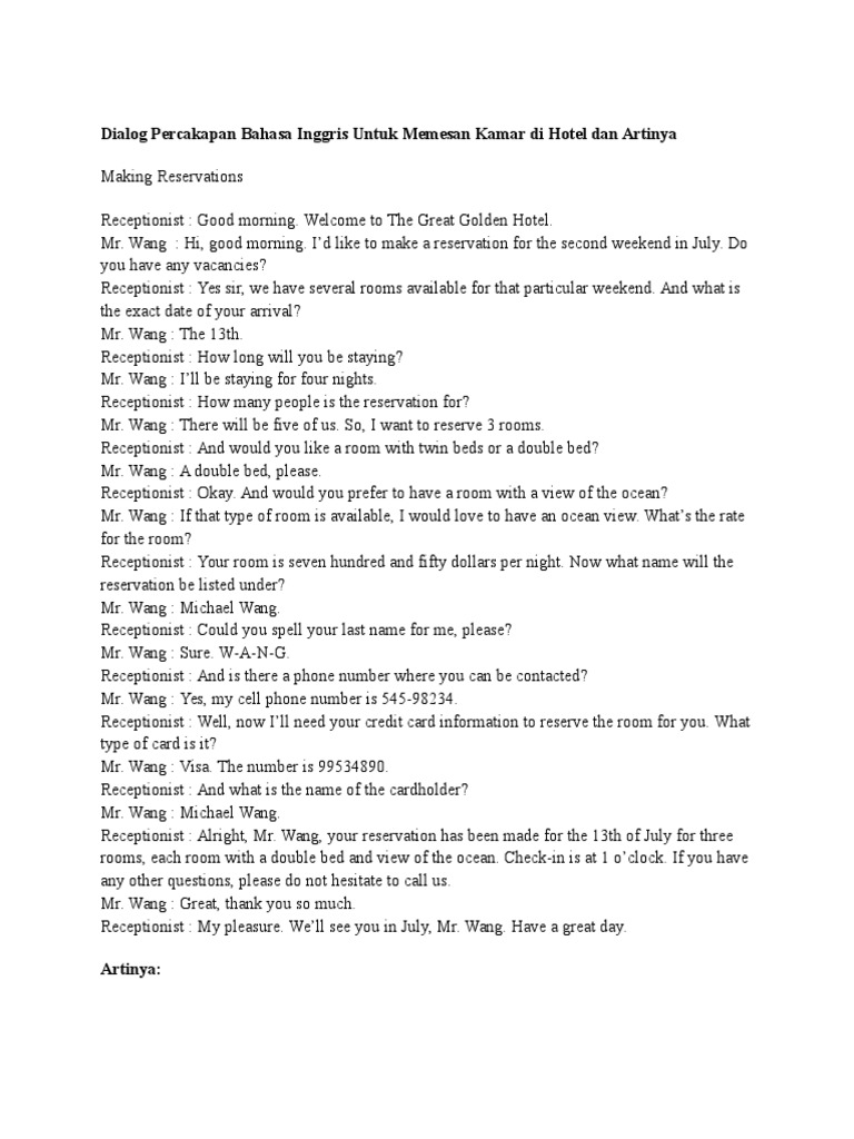 Dialog Percakapan Bahasa Inggris Untuk Memesan Kamar Di Hotel Dan …