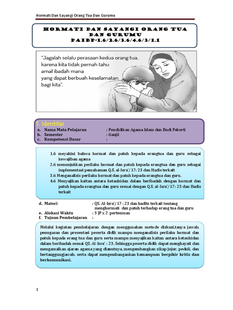 Rpp pai kelas iv semester 1 akhlak terpuji, hormat kepada orang tua, …