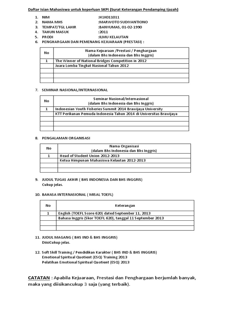 Contoh Isian Blangko SKPI 0