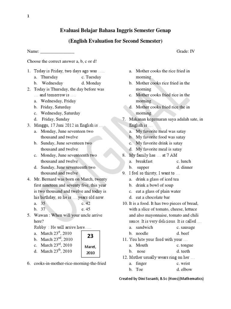 Contoh Soal Bahasa Inggris Kelas 4 Sd Semester 2 - Contoh Soal Terbaru