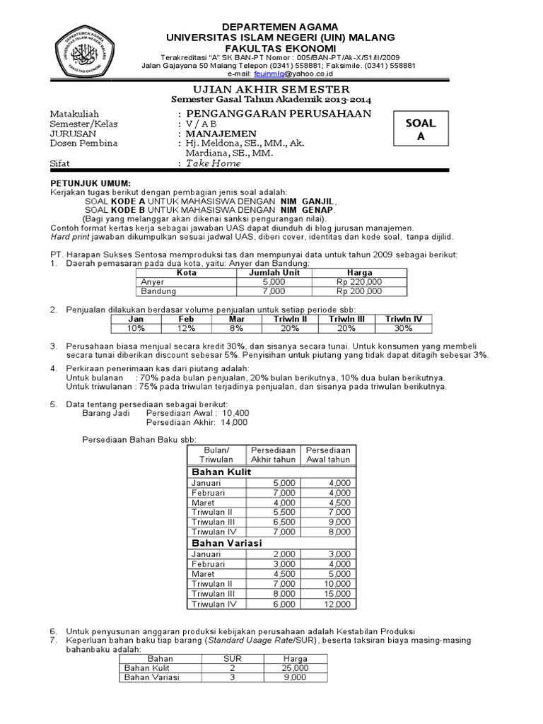 SOAL UAS Penganggaran Gasal 13-14 A