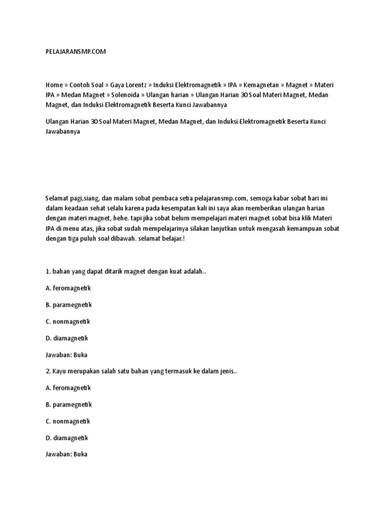Ulangan Harian 30 Soal Materi Magnet, Medan Magnet, dan Induksi …