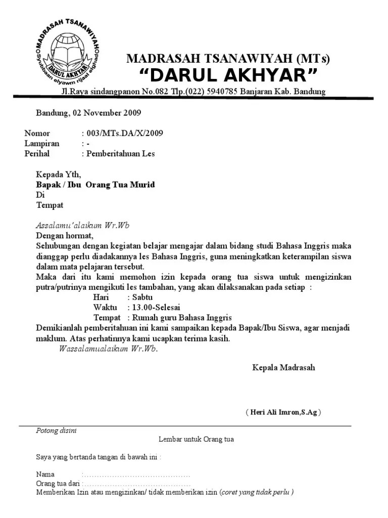 Contoh Surat Persetujuan Orang Tua Untuk Study Tour