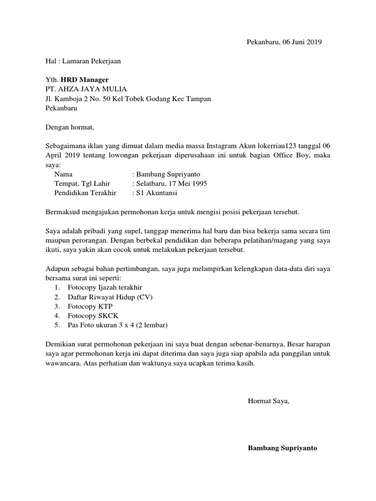 Contoh Surat Lamaran Kerja Office Boy - Gawe CV