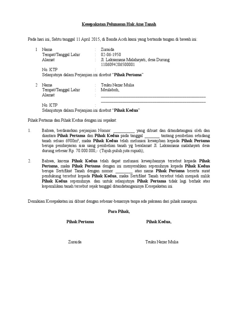 Contoh Kesepakatan Pelunasan Pembelian Tanah