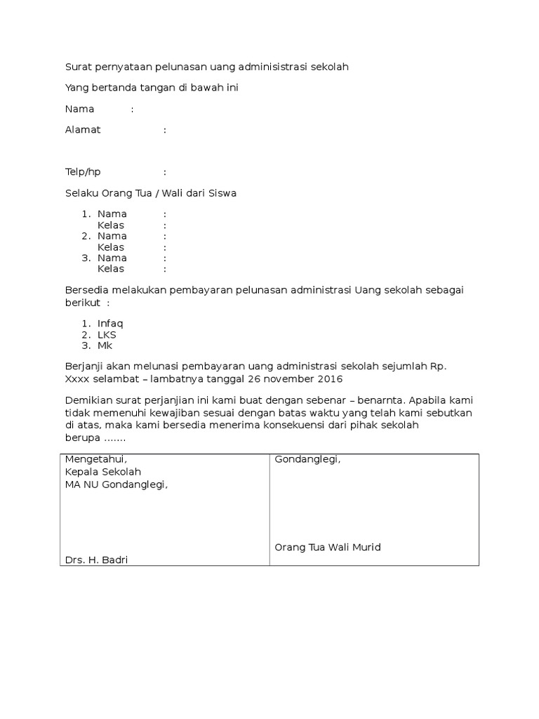 Surat Pernyataan Pelunasan Uang Adminisistrasi Sekolah