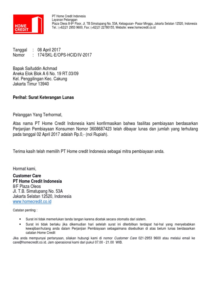 Contoh Surat Keterangan Lunas Kredit Dari Bank - Dapatkan Contoh
