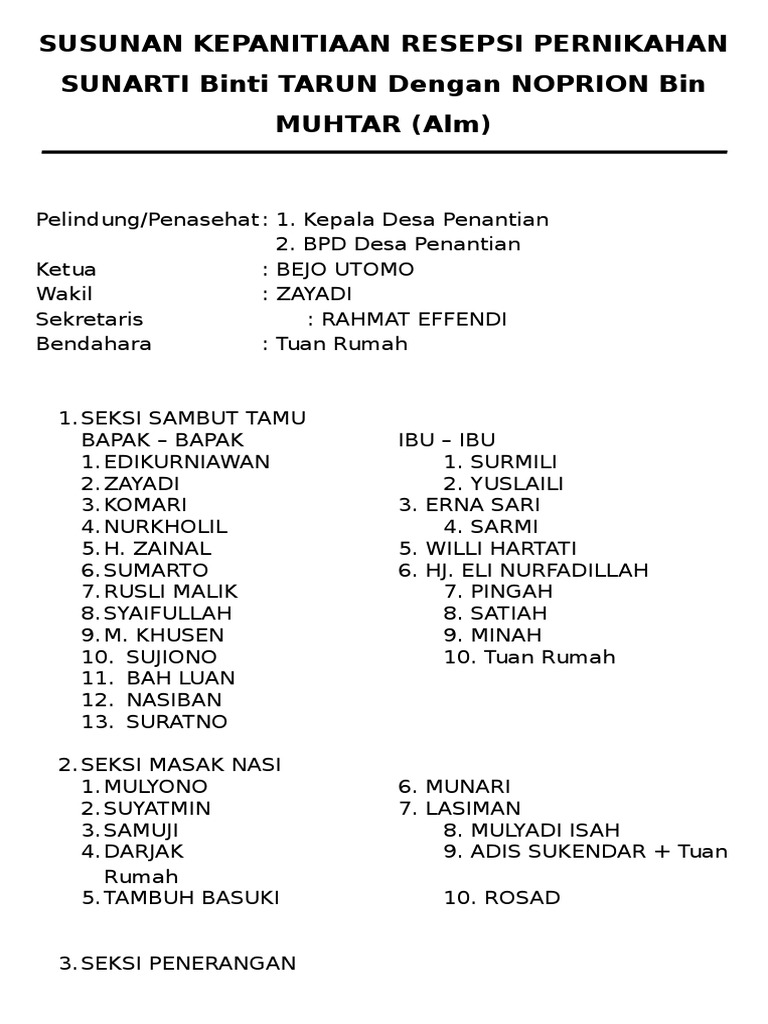 SUSUNAN PANITIA RESEPSI PERNIKAHAN