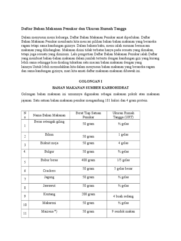 Daftar Bahan Makanan Penukar Dan Ukuran Rumah Tangga