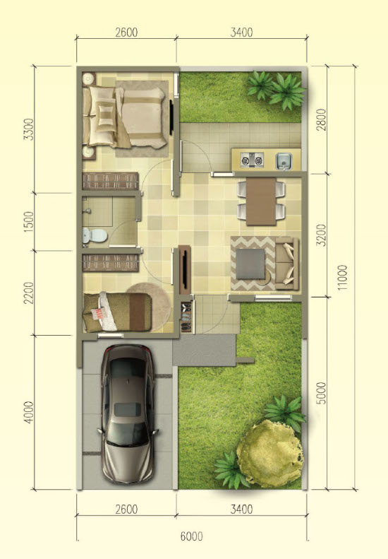 LINGKAR WARNA: Denah rumah minimalis ukuran 6x11 meter 2 kamar tidur 1 lantai + tampak depan