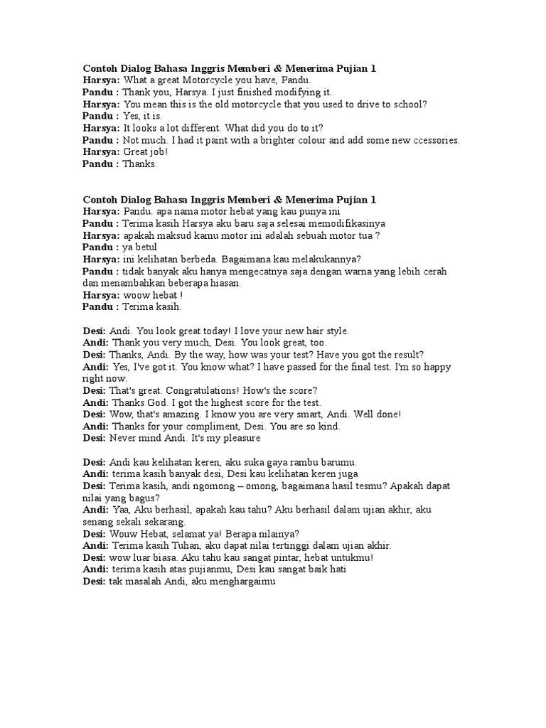 tolong buatin contoh teks bhs.inggris percakapan tentang pujian. - Brainly.co.id