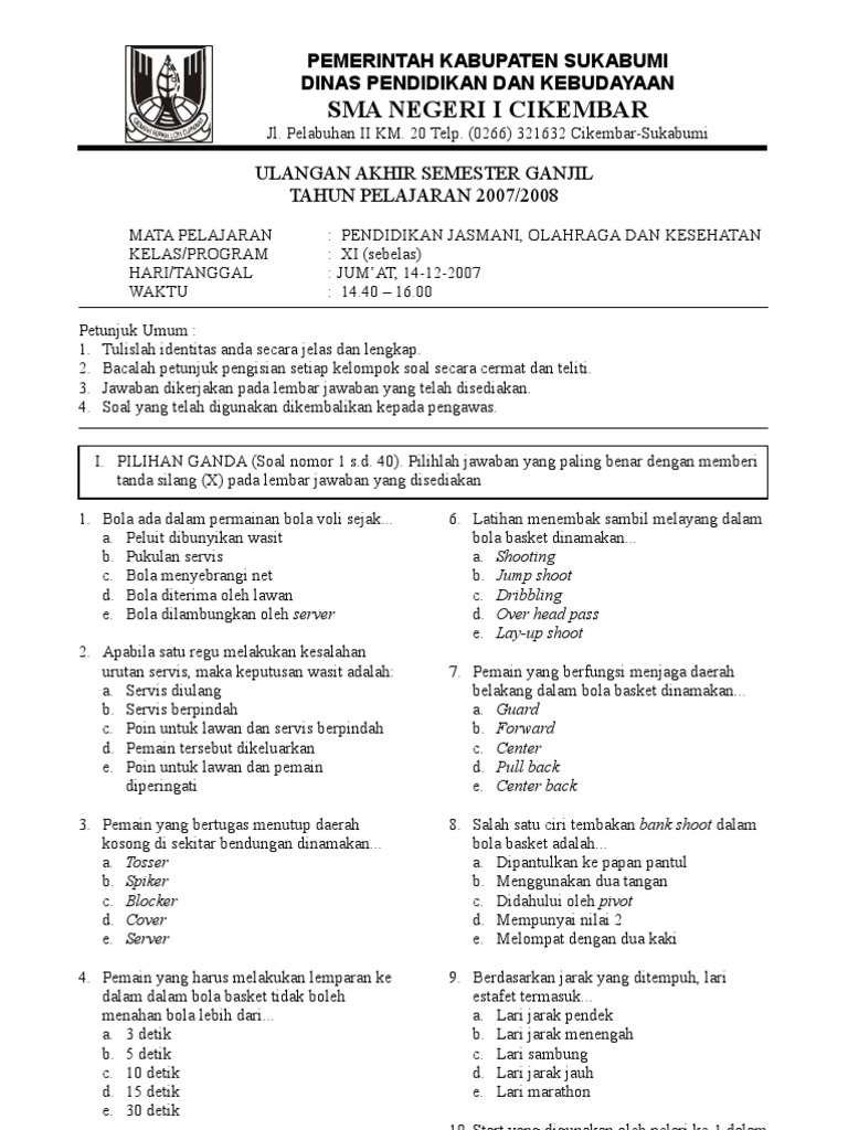 Soal Penjaskes UTS Ganjil Kelas XI