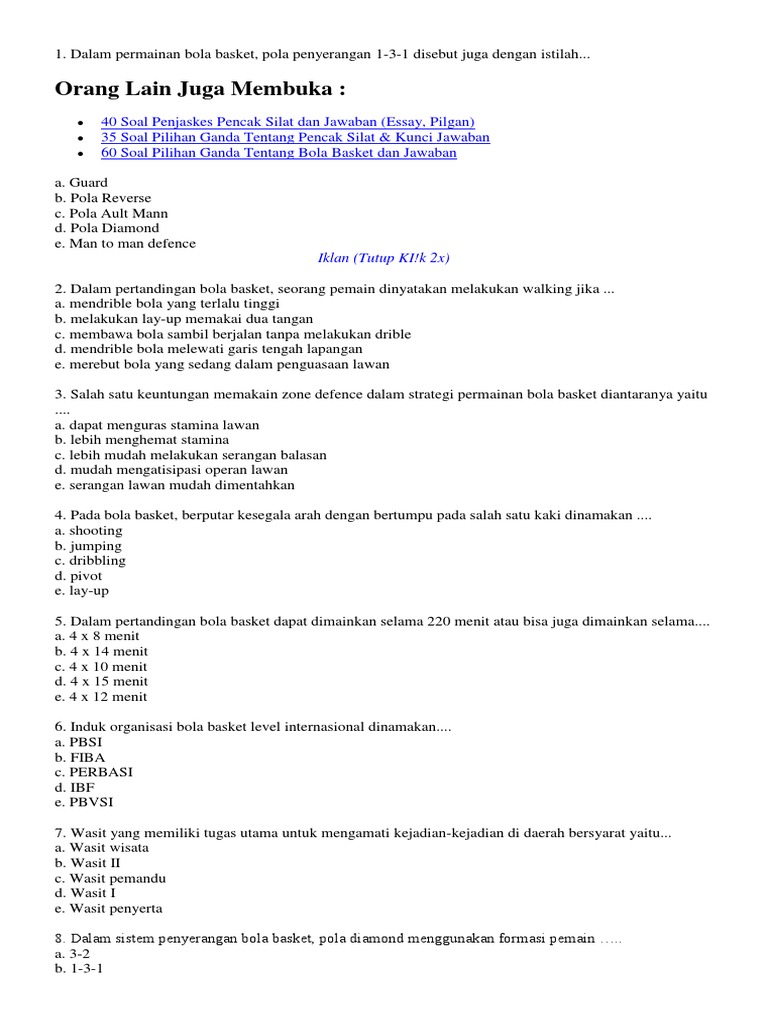 Soal Penjaskes Bab Bola Basket (Pilgan - Essay) & Jawaban …