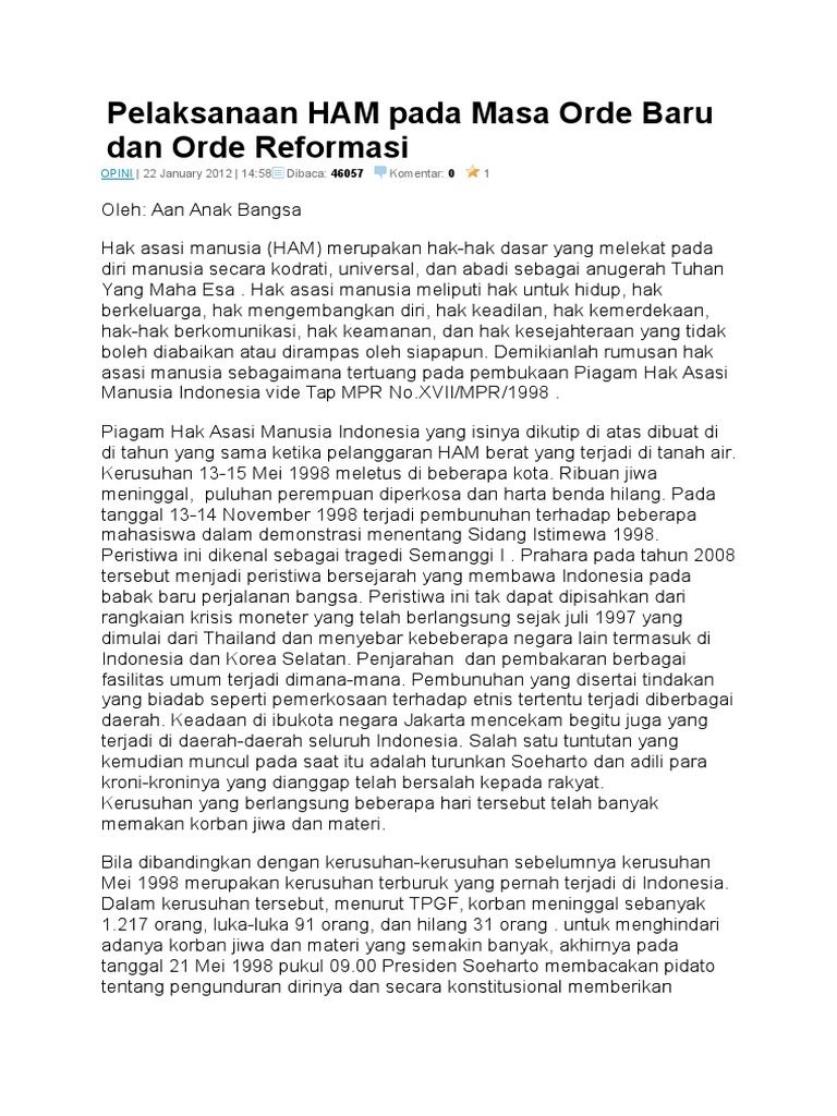 Pelaksanaan HAM pada Masa Orde Baru dan Orde Reformasi: | 22 January 2012 | 14:58 Dibaca: Komentar: 1