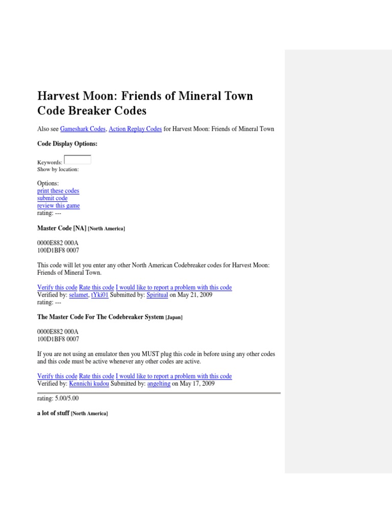 Harvest moon more friends of mineral town cheat codes