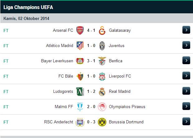 Hasil Pertandingan Liga Champions Kamis, 02 Oktober 2014