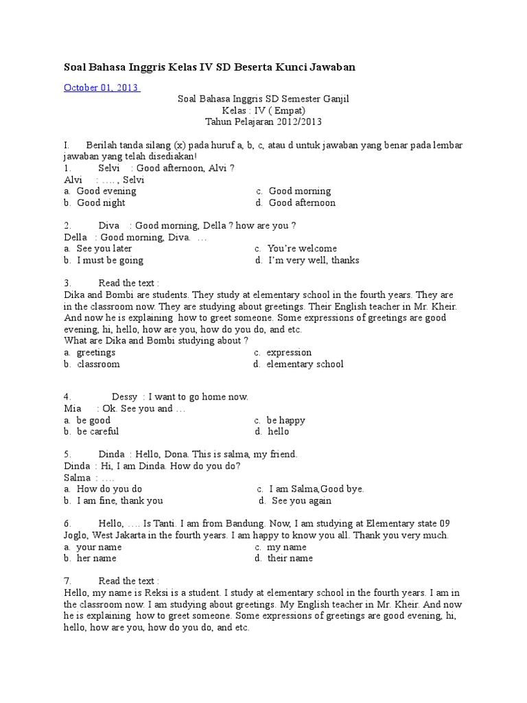 Soal Bahasa Inggris Kelas IV SD Beserta Kunci Jawaban semester …