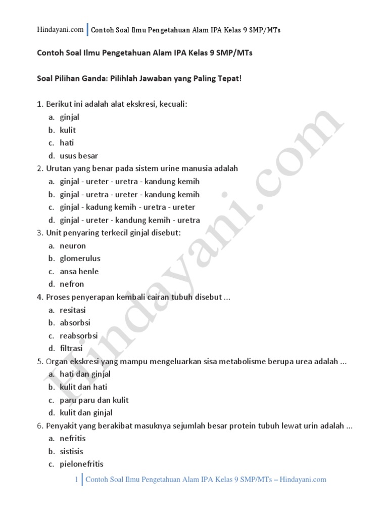 Soal IPA Kelas 9 SMP Bab 1 Sistem Ekskresi Dan Kunci Jawaban - Bimbel Brilian
