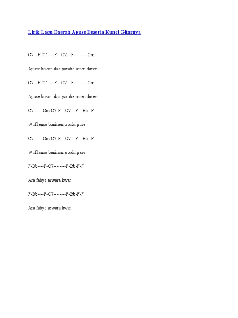 Lirik dan Chord Apuse, Lagu Daerah Asal Papua