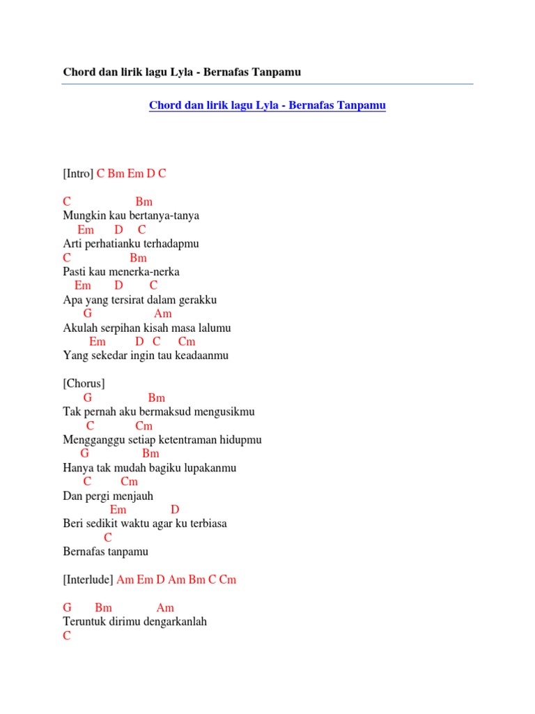 Chord Dan Lirik Lagu Lyla - Bernafas Tanpamu