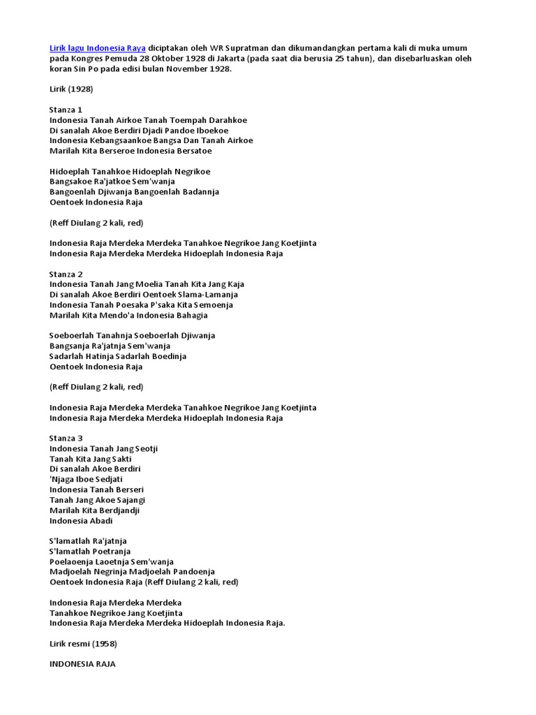 Lirik Lagu Indonesia Raya Lengkap 3 Stanza