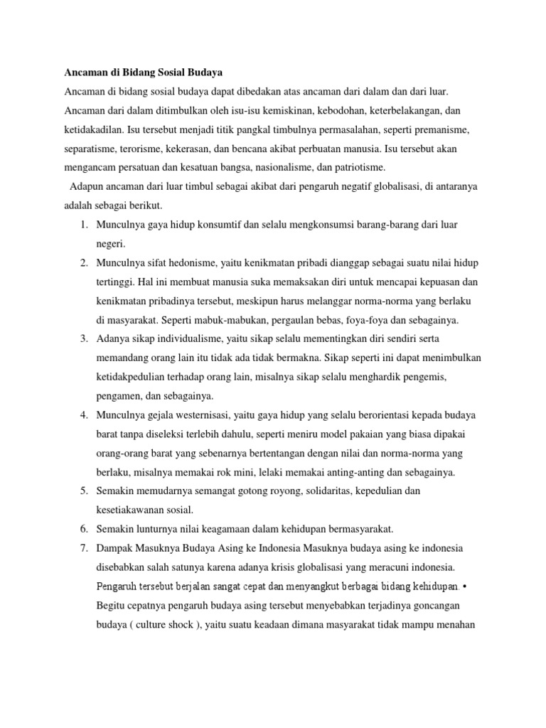 ANCAMAN DIBIDANG SOSIAL BUDAYA.doc - Ancaman di Bidang Sosial Budaya HAKEKAT Ancaman yang berdimensi sosial budaya dapat dibedakan atas ancaman dari | Course Hero