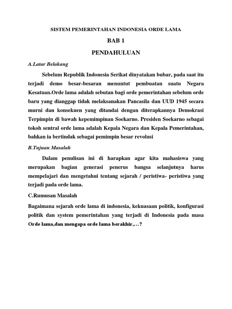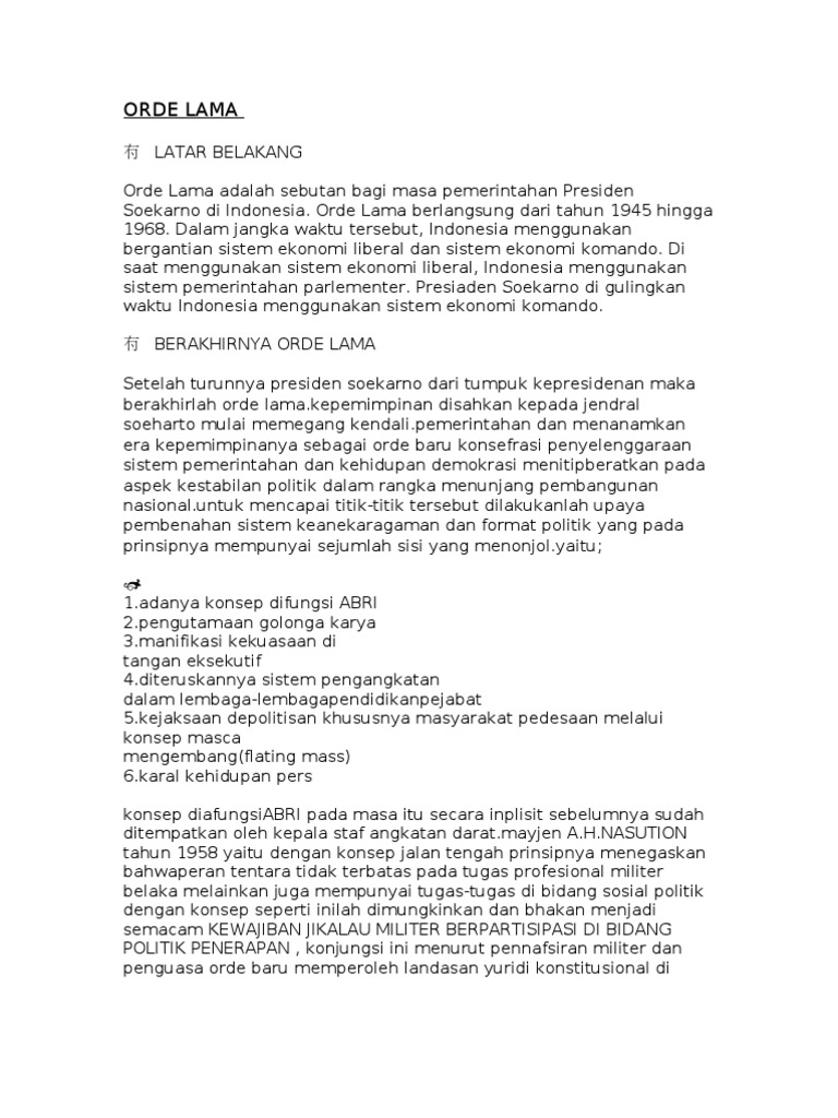 ORDE LAMA.doc - BAB I PENDAHULUAN A Latar Belakang Orde Lama adalah sebutan bagi masa pemerintahan Presiden Soekarno di Indonesia Orde Lama berlangsung | Course Hero