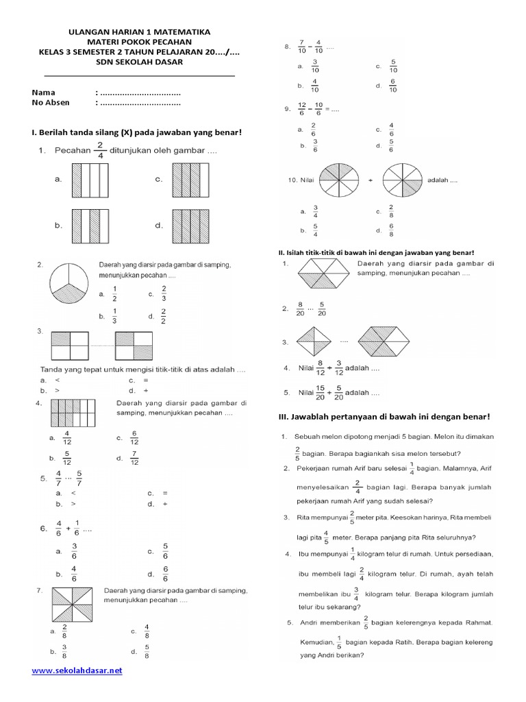 Soal-soal Pecahan Matematika Kelas 3 Semester 2 - SekolahDasar.Net