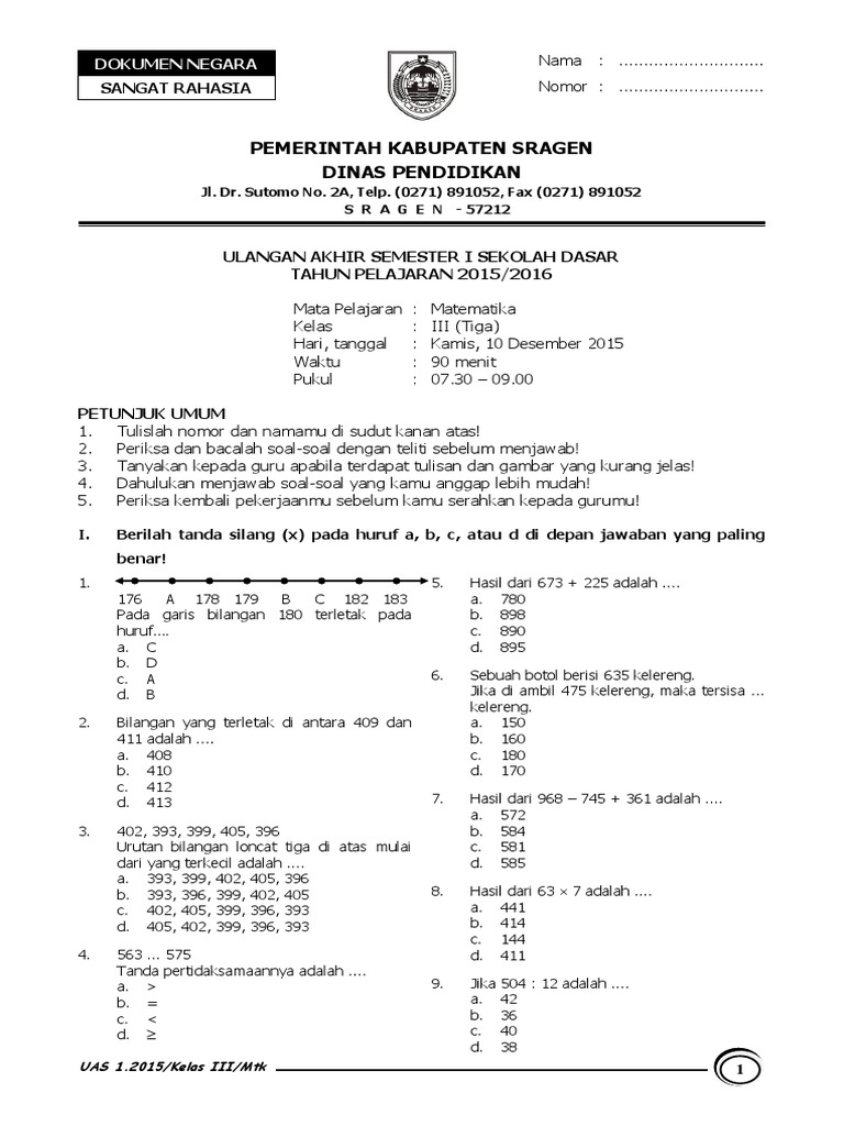 DOC) contoh soal UAS Matematika kelas 3 Semester 1 | Rachmah …