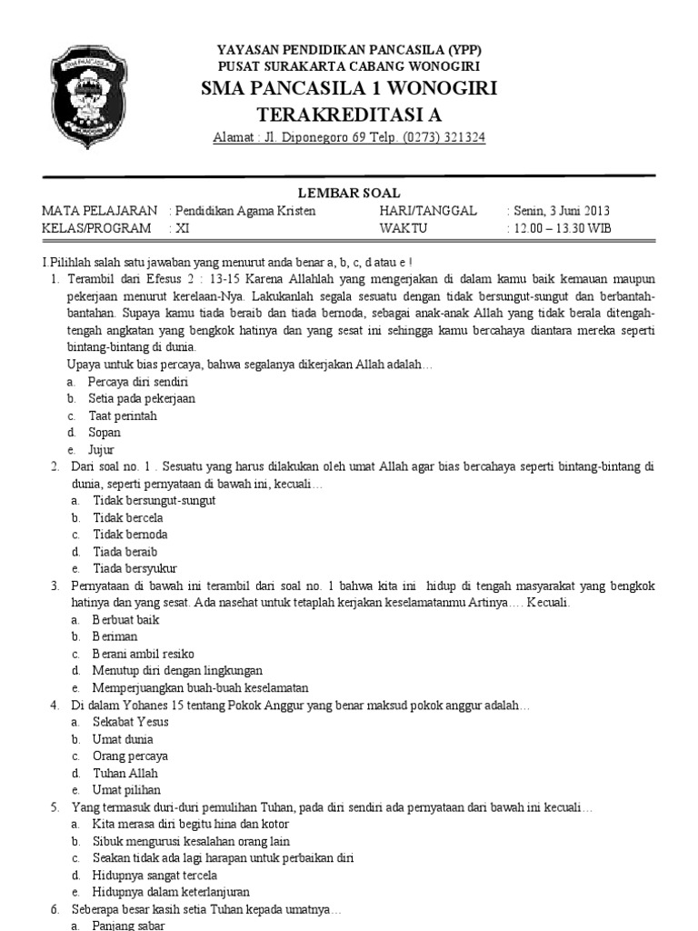Soal Agama Kristen Smk Kelas Xi