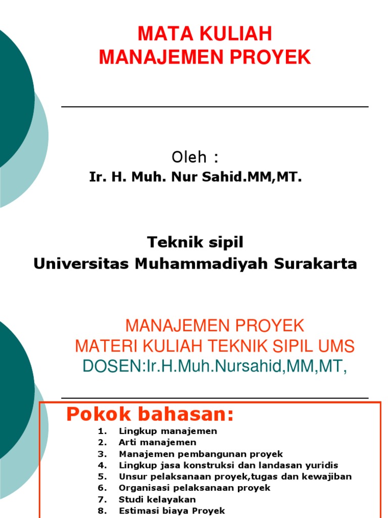 POKOK-POKOK MATERI MATA KULIAH MANAJEMEN PROYEK oleh : Muarif, ST, MT Jurusan Teknik Sipil Universitas Andi Djemma Palopo. - ppt download