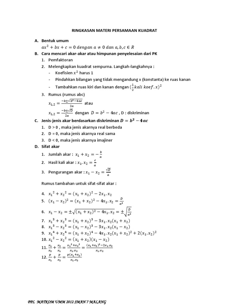 Ringkasan Materi Persamaan Kuadrat